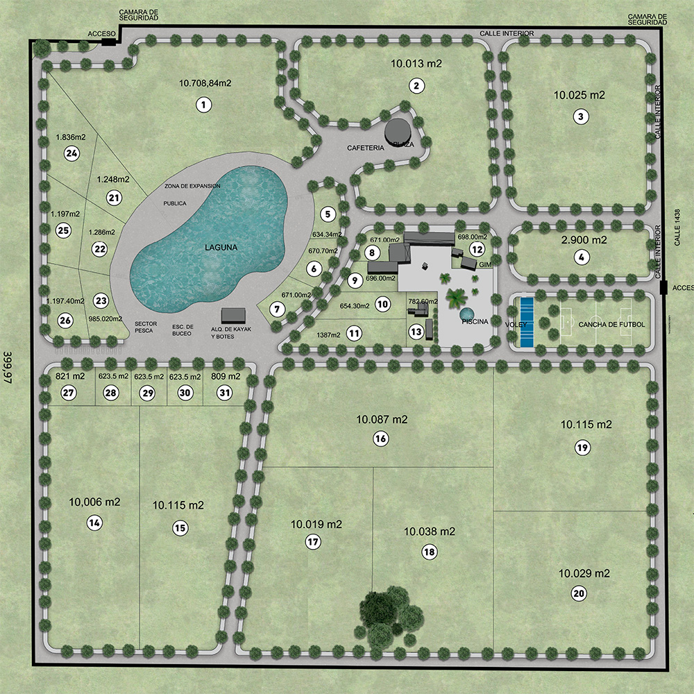 Se encuentra a 2800 metros de la bajada de la Autopista Presidente Perón, sobre la Avenida Espora, y a 3500 metros de la estación de tren de la ciudad. El proyecto consta de 10 lotes, cada uno con una superficie mínima de 10.000 m².
